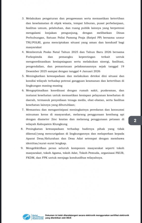 Menindaklanjuti Surat Edaran Bupati Klungkung tentang Himbauan Perayaan Hari Raya Natal 2025 dan Tahun Baru 2026, kami dari Pemerintah Desa mengingatkan agar masyarakat tetap menjaga ketertiban dan keamanan guna mewujudkan situasi Desa Tegak yang kondusif.